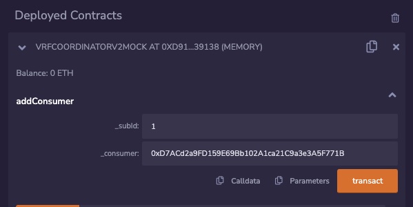 5. Call the VRFCoordinatorV2Mock addConsumer function to add your consumer contract to your subscription.